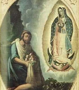 E aconteceu, lê-se no Nican Mopohua, que havia um índio, um pobre homem do povo, de nome Juan Diego, segundo se diz natural de Cuuahtitlán. Em 9 de Dezembro de 1531, um sábado, de manhã cedo, dirigia-se à cidade do México, para ir ao catecismo. Quando passava junto a um pequeno cerro chamado Tepeyac, ouviu cantar no alto do cerro, como se fosse o canto maravilhoso de muitos pássaros. Encantado, aquele homem pensou que estava no paraíso. E, quando o canto acabou de repente, quando se fez silêncio, ouviu que o chamavam de cima do pequeno cerro, dizendo: “Juanito, Juan Dieguito”. Muito contente, dirigiu-se ao lugar de onde vinha aquela voz e viu uma nobre Senhora que ali estava em pé e que o chamava para se aproximar d’Ela. Ao chegar à sua presença, ficou encantado com a sua nobreza sobre-humana: as suas vestes eram radiantes como o sol; e a pedra, a falésia onde estava de pé, lançava raios resplandecentes.